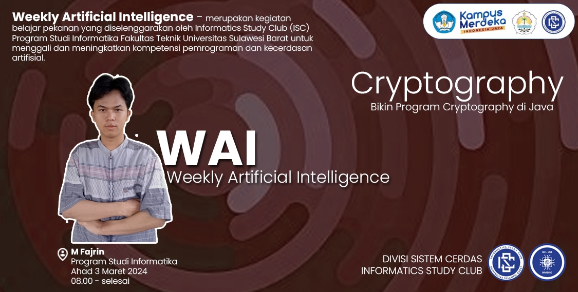 Informatics Study Club (ISC) – kali ini akan membahas tentang pembuatan aplikasi kriptografi (cryptography) sederhana menggunakan bahasa pemrograman Java. Diskusi dan sharing ini bertujuan untuk melatih kemampuan mahasiswa dalam menerapkan konsep pemrograman berorientasi objek di Java untuk membuat aplikasi kriptogafi disertai dengan pengembangan Graphical User Interface (GUI). Topik Cryptography ini akan dibawakan oleh M Fajrin.