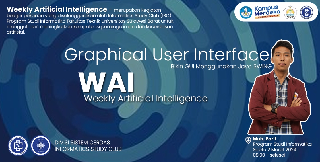 Untuk pekan pertama sabtu tanggal 2 Maret 2024 ini InsyaAllah Informatics Study Club (ISC) – Divisi Sistem Cerdas akan menyelenggarakan WAI dengan topik Pemrograman Graphical User Interface menggunakan Java yang akan dibawakan oleh Muh. Parif